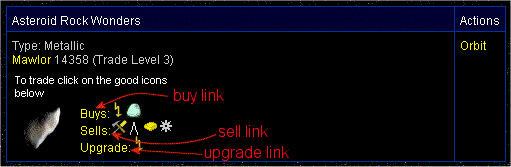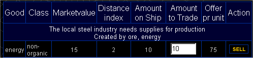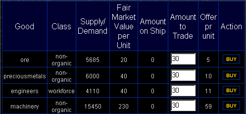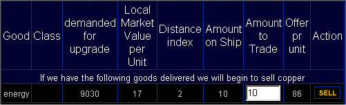 On this screen, you sell goods to the planet. You can sell all goods, except the ones